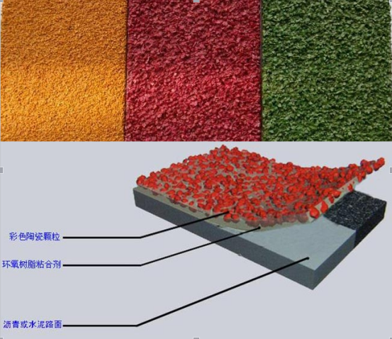 5、撒布彩色陶瓷顆粒:將彩色陶瓷顆粒均勻撒布于剛刮涂均勻的彩色路面專用粘接料表面,完全將樹脂材料覆蓋;(自行車道、人行道陶瓷顆粒指標(biāo)、【1---2mm】、公交車站臺、高速公路、陶瓷顆粒指標(biāo)【2---4mm】)